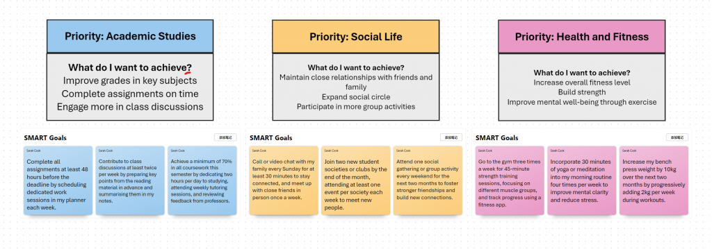 In the class, I set up some short-term plans including. Study for two hours every day, watch an hour of programming tutorial videos every day, call my family twice a week, organize a party with my classmates every week, join a basketball club once a week, increase my weight to 75kg by January, go to the gym four times a week and other goals (I wrote in the draft book in class).In this activity, we can customize different plans and goals for ourselves through hard thinking, so that our lives will become less confused. You can use some of the scattered time to do something meaningful. In this activity, I set goals to make myself more motivated to complete some of the tasks that I want to accomplish and want to accomplish. This can greatly improve our work efficiency.This activity is very meaningful to me