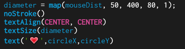 In the process of making this work, I thought about how to apply the knowledge I learned in class and how to produce good interactive animation. Then I came across some pictures of love. Love is very dynamic when it is enlarged and shrunk, just like the feeling of our heart beating. Love is very romantic. Pink and red make me feel love and warmth.So I plan to use the distance mapping of the mouse to the proportion of the circle to make an interactive effect about love.