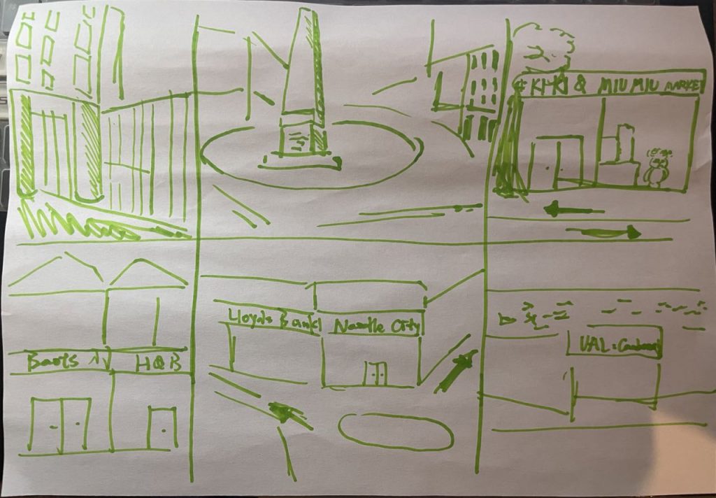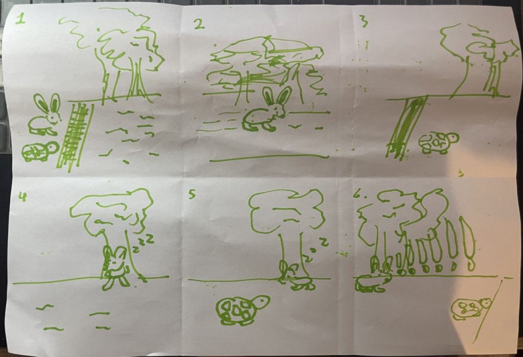 In the second hour, the teacher asked us to tell a story in the simplest way, any story could be described with colored pencils. I drew some scenes on my way to school, the story of the tortoise and the hare, and the process of making a hamburger(haven’t finish yet).