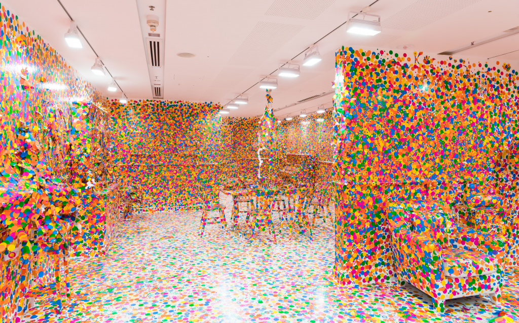 At the beginning of the class, the teacher told us about an artist named Yayoi Kusama. This is a Japanese artist. I have seen many of her works, which are composed of a pumpkin, dots of different shapes and sizes, and different colors. This artist seems to have a special situation that makes her see the world like this. But I like her art works very much. I think it has a sense of commercial art. Then she introduced us to one of her works. Everything in a space is white. The tables, chairs and some lights are all white. Then everyone who comes to visit this space can use colored pens to add some dots of different colors to this space. It is a bit similar to the interaction in our last class. But the finished product of this work is very amazing. I like this work very much.